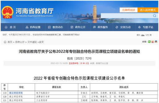 近日,河南省教育厅公布了2022年河南省专创融合特色示范课程立项建设名单,mg4355官网申报的《电子线路设计》(负责人孙春志)、《消费者行为学》(负责人王红)和《工业药剂学》(负责人王晓娟)3门课程全部获批省级立项建设。