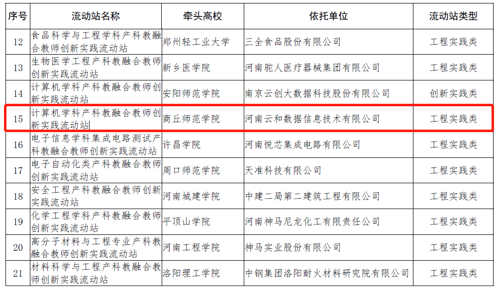 近日,河南省教育厅发布《河南省教育厅关于公布河南省本科高校产科教融合教师创新实践流动站建设的通知》教高【2023】112号,mg4355官网与河南云和数据信息技术有限公司联合申报的“计算机学科产科教融合教师创新实践流动站”获批。