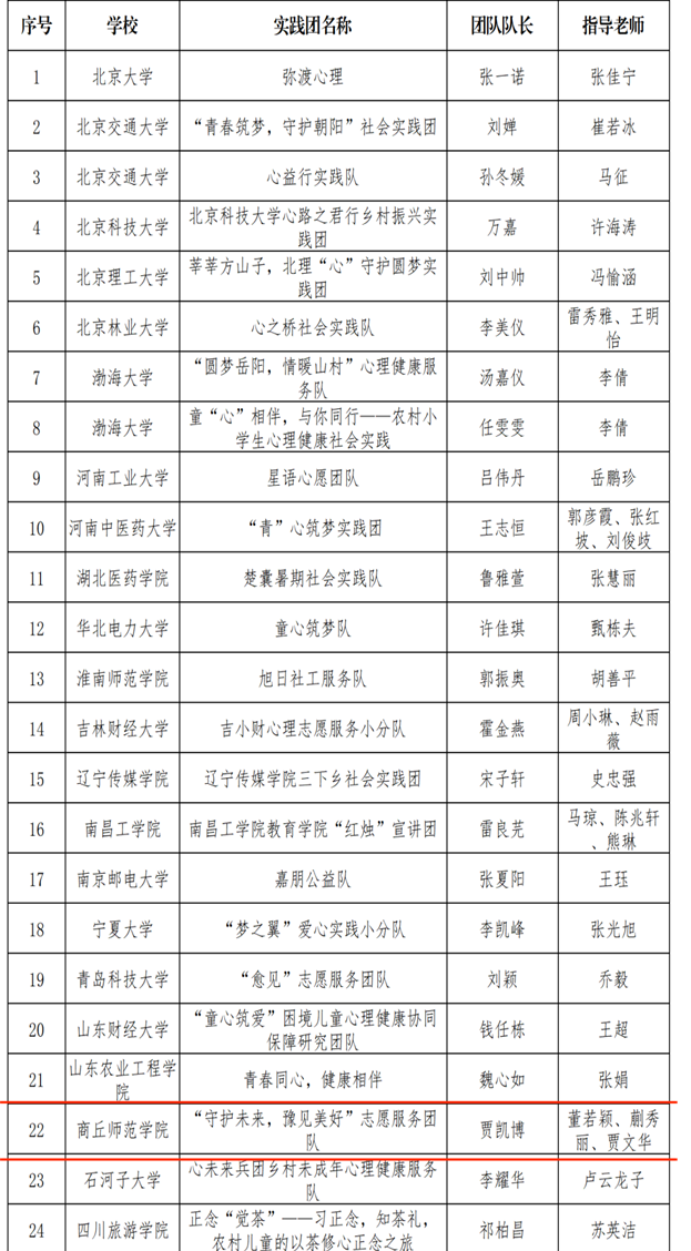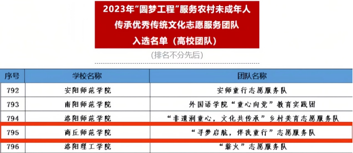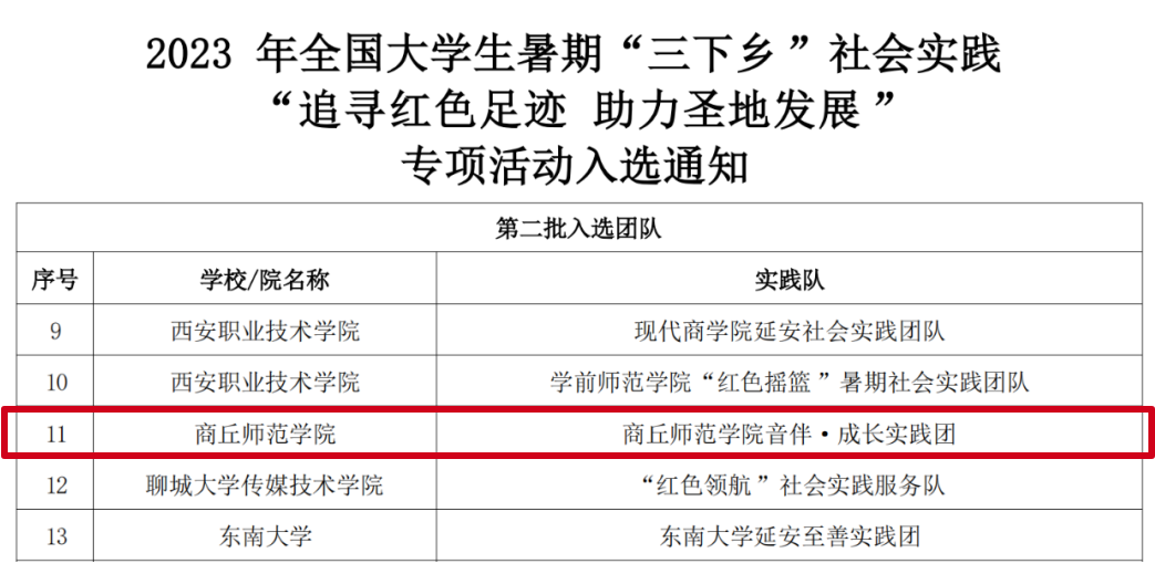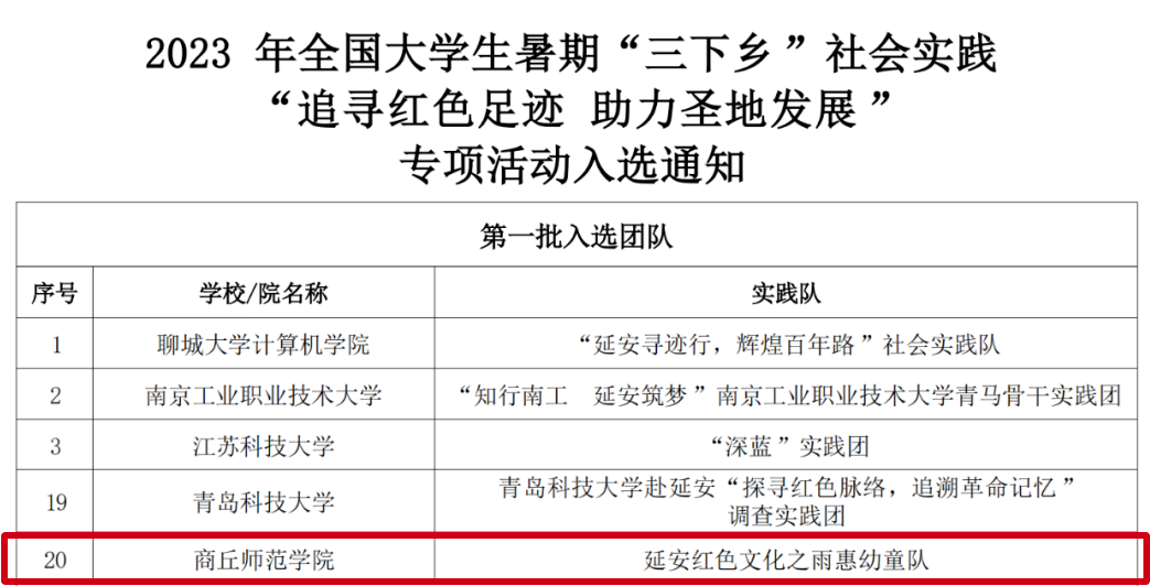 青春三下乡,奋斗正当时,随着社会实践活动,如火如荼的开展,mg4355官网多个社会实践团队,接连传来喜讯。mg4355官网青年志愿者协会和信息技术学院共同组建的“寻梦启航,伴我童行”志愿服务队入选2023年“圆梦工程”服务农村未成年人传承优秀传统文化志愿服务团队。音乐学院申报的“红色轻骑兵实践团”入选2023年“井冈情·中国梦”大学生暑期实践季专项活动。教师教育学院申报的“延安红色文化之雨惠幼童”实践团队入选第一批“追寻红色足迹 助力圣地发展”三下乡社会实践专项活动。音乐学院、法学院共建的“音伴·成长实践团”入选第二批“追寻红色足迹 助力圣地发展”三下乡社会实践专项活动。教师教育学院“守护未来,豫见美好”志愿服务团队入选2023年“圆梦工程”农村未成年人心理健康教育志愿服务项目大学生暑期心理健康社会实践活动。教师教育学院“童心同行”志愿服务团队入选2023年全国大中专学生“三下乡”社会实践活动之乡村振兴“笃行计划”专项活动全国性示范实践团队。