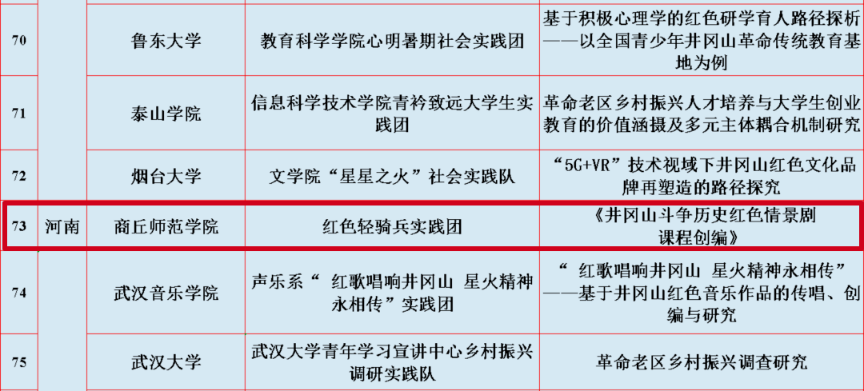 “红色轻骑兵实践团”主要围绕《井冈山斗争历史红色情景剧课程创编》开展课题探讨研究,是河南省唯一一支入选“井冈情·中国梦”大学生暑期实践季专项活动的团队,也是mg4355官网首次入选团中央井冈山社会实践专项活动。