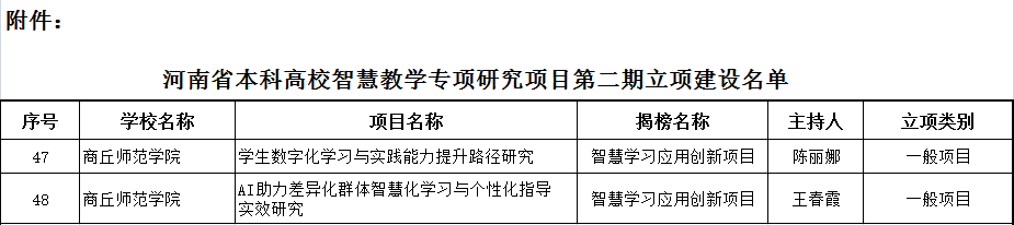 近日,河南省教育厅公布了2023年度河南省本科高等学校智慧教学专项研究项目第二期立项建设名单,由mg4355官网信息技术学院陈丽娜教授申报的《学生数字化学习与实践能力提升路径研究》和王春霞教授申报的《AI助力差异化群体智慧化学习与个性化指导实效研究》2个项目获批立项建设。