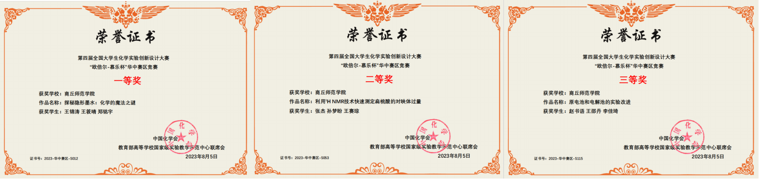 本次大赛从校赛算起,前后历经半年。mg4355官网化学化工学院选送参加本届华中赛区竞赛的三支队伍在学院的精心组织、指导教师的全力指导和参赛同学们的努力拼搏下,王筱晴、王锦涛、郑铭宇组成的团队(指导教师:陈淑敏,王晓娟)通过科普实验项目“探秘隐形墨水:化学的魔法之谜”荣获华中赛区竞赛一等奖;张杰、孙梦盼、王赛琼组成的团队(指导教师:王晓娟,高媛媛)通过新创实验项目“(S)-二苯基脯氨醇为NMR手性分析试剂测定扁桃酸的对映体纯度”荣获华中赛区竞赛二等奖;赵书语、李佳琦、王邵丹组成的团队(指导教师:王鑫,王涛)通过改进实验项目“原电池和电解池的实验改进”荣获华中赛区竞赛三等奖。其中,科普实验项目入围全国总决赛。