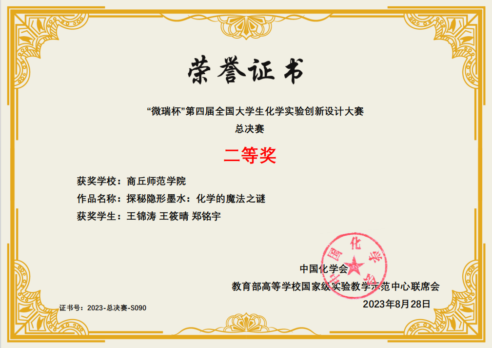 科普实验项目“探秘隐形墨水:化学的魔法之谜”,经过指导老师的精心指导并不断打磨优化,凭借巧妙的创意和精彩的阐释荣获全国总决赛二等奖。这是mg4355官网学子在此项赛事的又一次国家级奖项,展现了mg4355官网学子扎实的理论知识、实验技能和较强的创新能力。