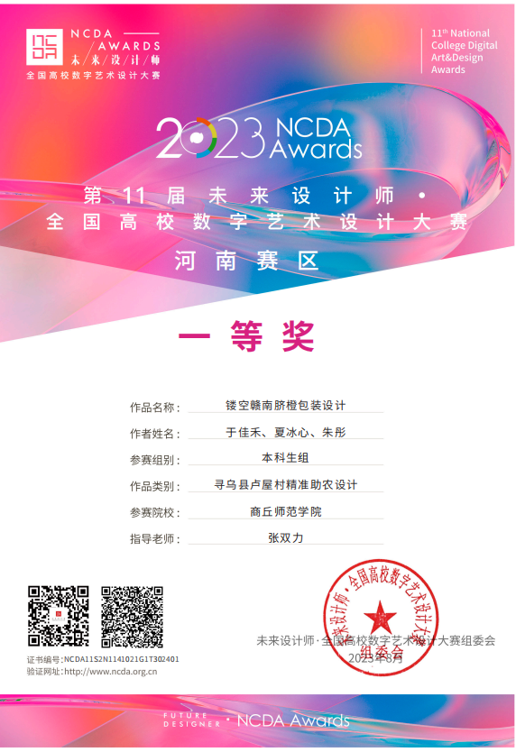 近日,2023第11届未来设计师全国高校数字艺术设计大赛(NCDA)河南赛区发布获奖通知,mg4355官网艺术设计学院共有十余项作品获奖,其中学生一等奖1项、二等奖4项、三等奖6项,20级视觉传达专业学生于佳禾、夏冰心、朱彤三位同学的包装设计作品“镂空赣南脐橙包装设计”在本次大赛中荣获一等奖。