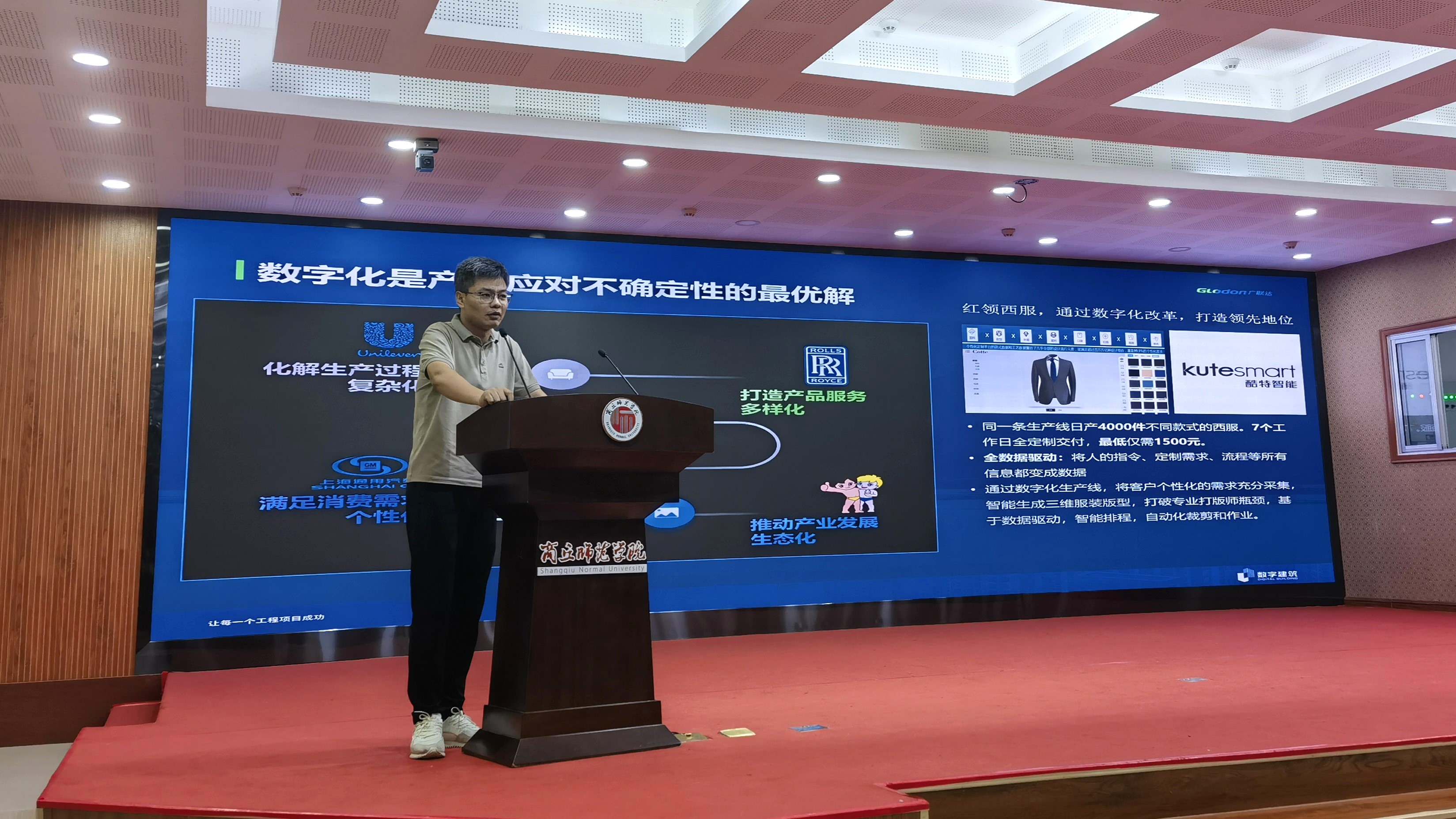 陈向炜、李忠宝共同为“智能建造” 产业学院揭牌,并向产业学院企方院长和校方院长颁发了聘书。广联达数字教育BU方案咨询部总监樊志光为师生代表做了《数字建筑的未来与发展》的报告。
