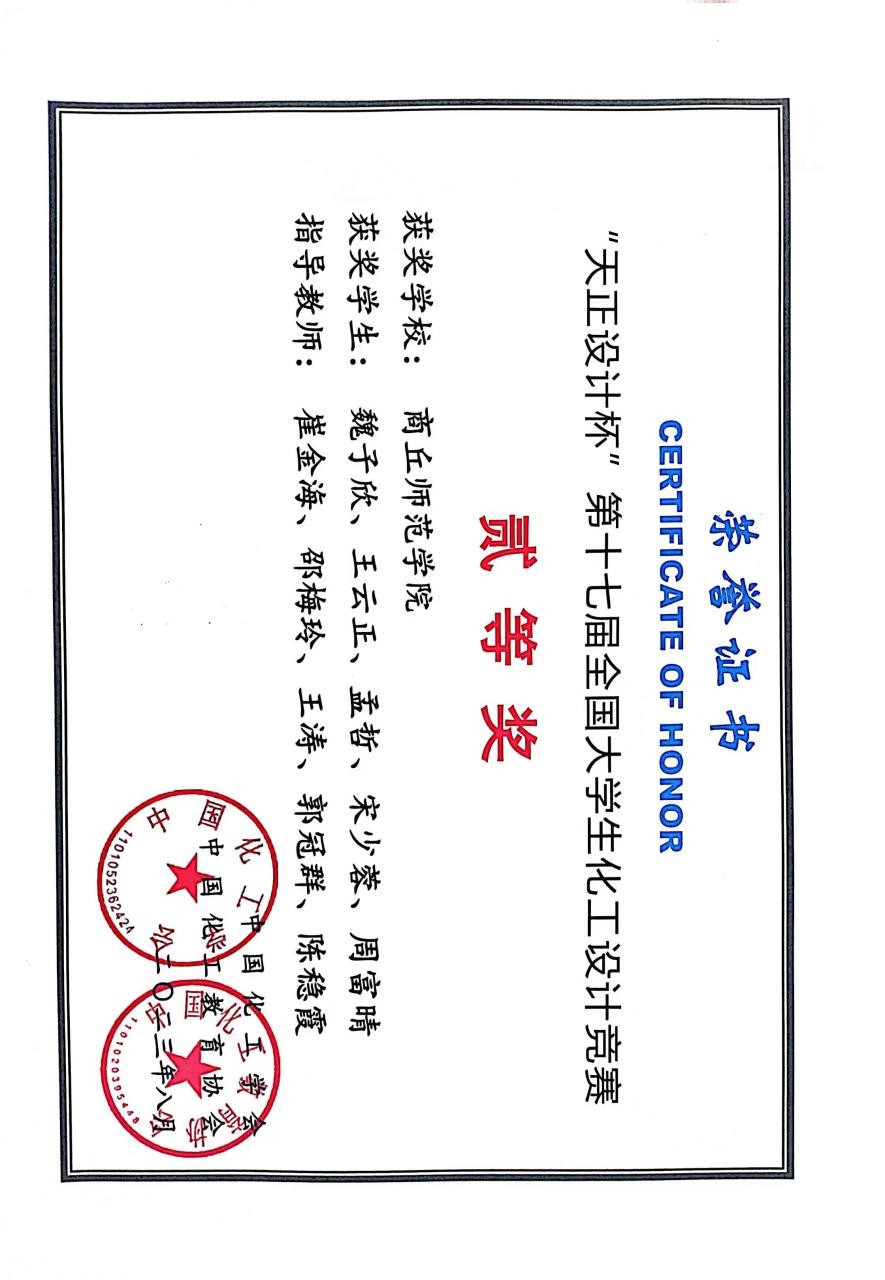 近日,由中国化工学会、中国化工教育协会主办的“天正设计杯”第十七届全国大学生化工设计竞赛圆满落幕。mg4355官网化学化工学院2021级本科生魏子欣、王云正、孟哲、宋少蓉、周富晴组成的代表队经过激烈角逐,荣获二等奖。