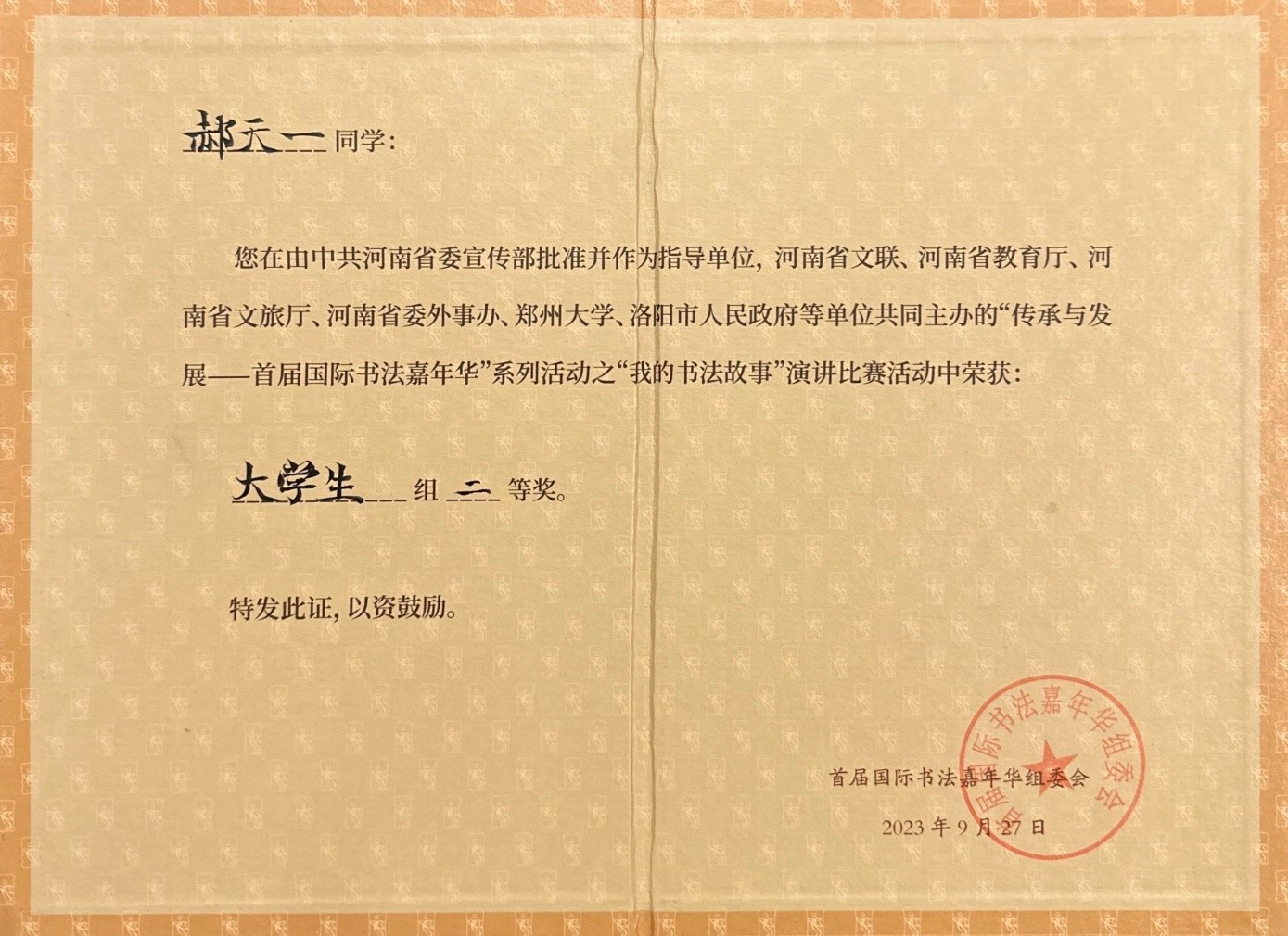 由河南省文联、河南省教育厅、河南省文旅厅、河南省委外办、郑州大学、洛阳市人民政府联合主办的“传承与发展——首届国际书法嘉年华”系列活动之一“我的书法故事”演讲比赛于2023年9月27日在河南省洛阳市张海书法艺术馆举行。