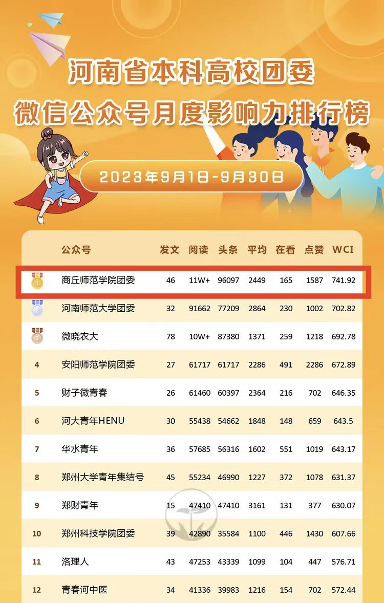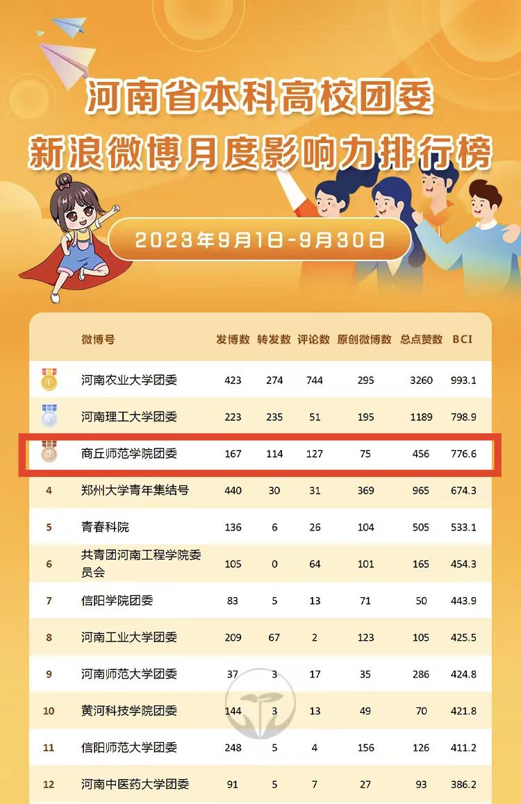 近日,河南省教育厅豫教思语公众号发布了2023年9月份“河南省高校团委月度新媒体影响力榜单”,mg4355电子线路团委官方微信公众号影响力排名位列全省高校第一,官方微博影响力排名也取得了全省高校第三的好成绩,显著提升了mg4355官网新媒体矩阵影响力。