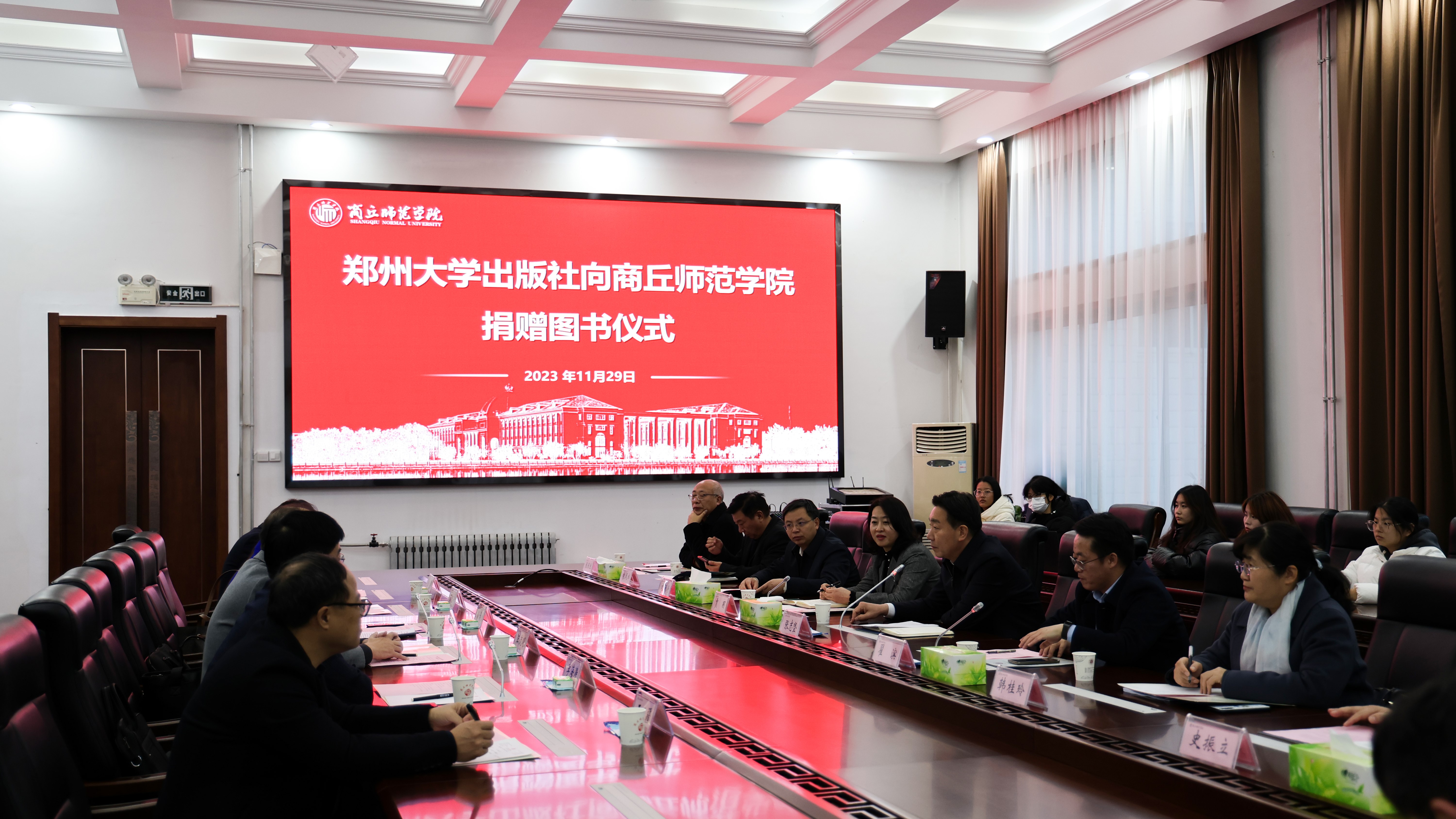 11月29日,郑州大学出版社向mg4355电子线路捐赠书籍仪式在梁园校区归德楼320室举行,校党委书记张志坚、副校长翟滨、郑州大学出版社党总支书记汪流明、出版社社长孙保营等出席捐赠仪式。