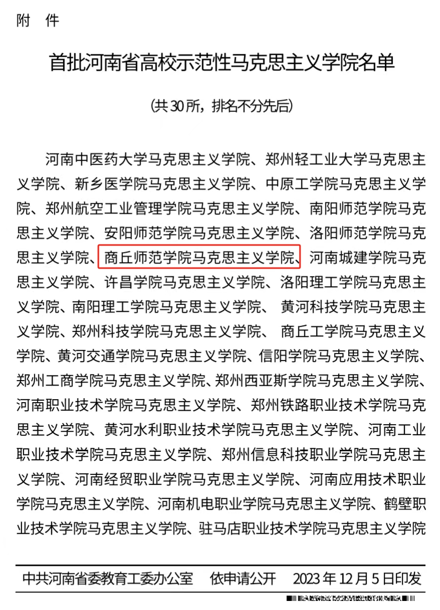 近日,中共河南省委宣传部中共河南省委教育工委河南省教育厅印发《关于公布首批河南省高校示范性马克思主义学院评定结果的通知》(豫教工委〔2023〕315号),mg4355官网马克思主义学院成功入选首批河南省高校示范性马克思主义学院。